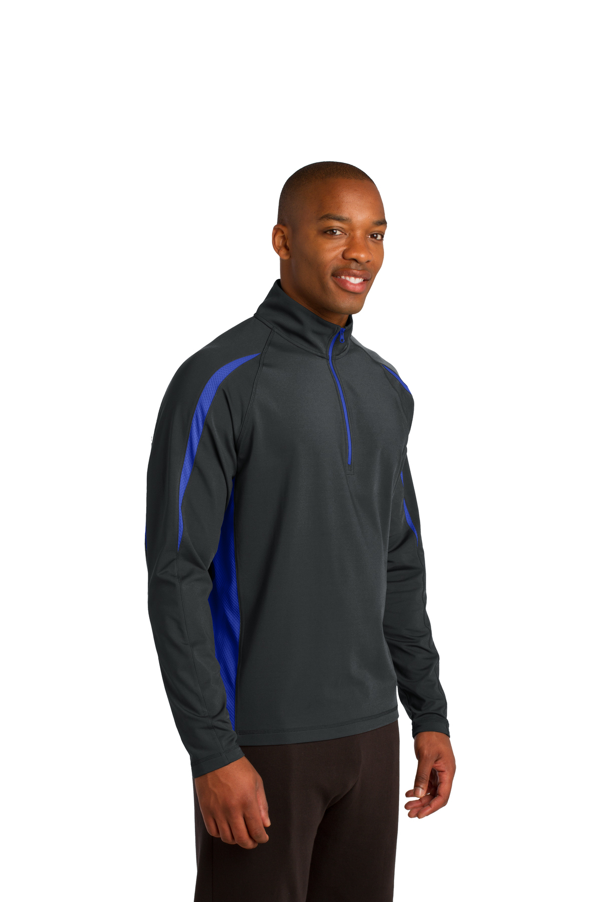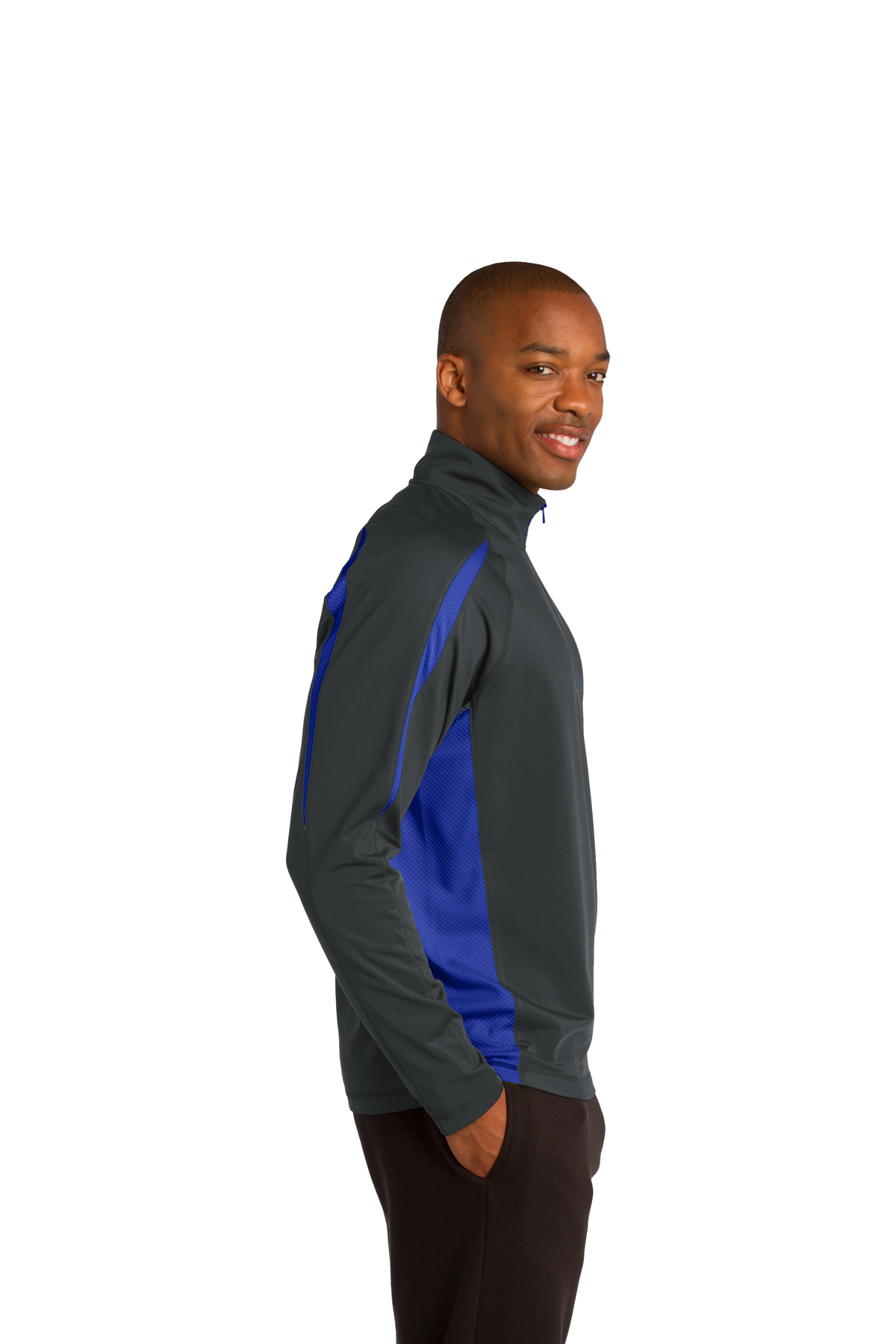 This soft-brushed pullover is stretchy and moisture-wicking with color splices and subtle texture.